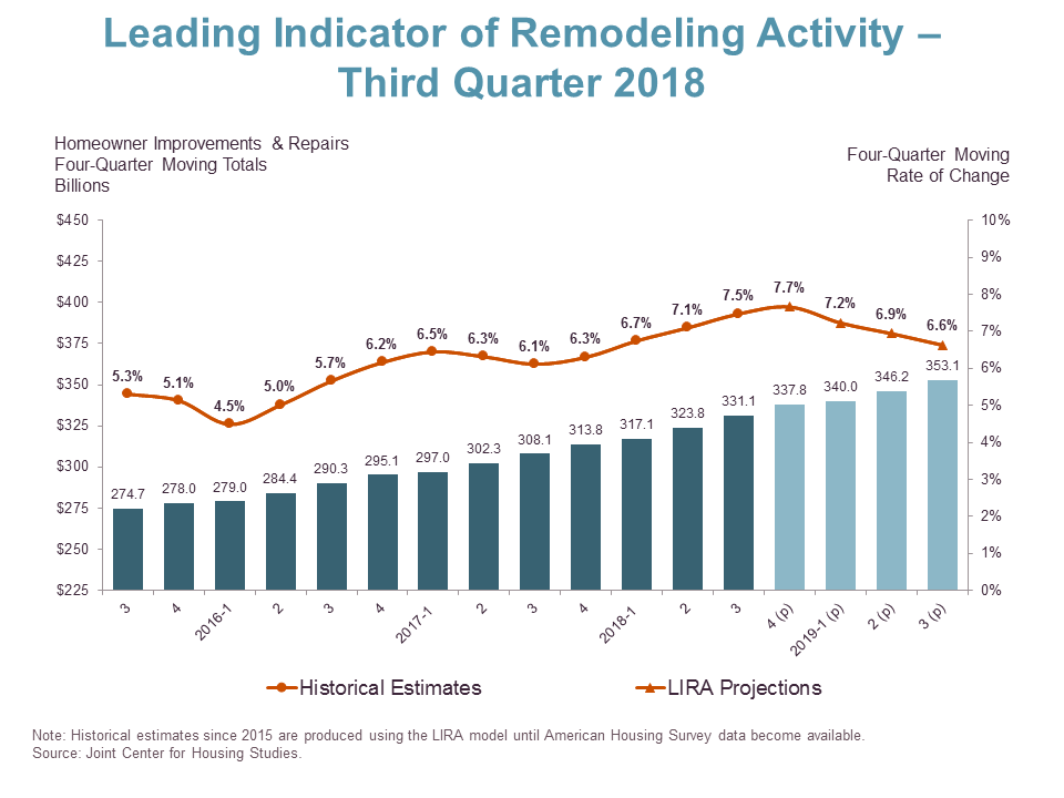 CAMBRIDGE, MA – After several years of solid acceleration, annual growth in national home improvement and repair spending is expected to soften in 2019, according to the Leading Indicator of Remodeling Activity (LIRA) released today by the Remodeling Futures Program at the Joint Center for Housing Studies of Harvard University. The LIRA projects that year-over-year increases in residential remodeling expenditures will reach a decade high of 7.7 percent this year and then start to drift downward to 6.6 percent through the third quarter of 2019.