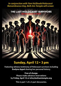 Beth Am Temple will screen the first installment of “The Last Survivors: Never Again is Now” on Sunday, April 12 at 3 pm. The documentary features witness testimony of Holocaust survivors, including that of survivor Evelyne Appel, who will share her personal history.